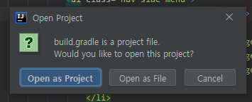 build.gradle 파일을 import하여 "open as Project" 선택. 프로젝트를 열어 확인해보면 아까 사이트에서 설정했던 내용대로 프로젝트 구조가 잡혀있고 설정파일 build.gradle에서 내가 dependencies로 넣어놨던 부분이 전부 들어가있다.