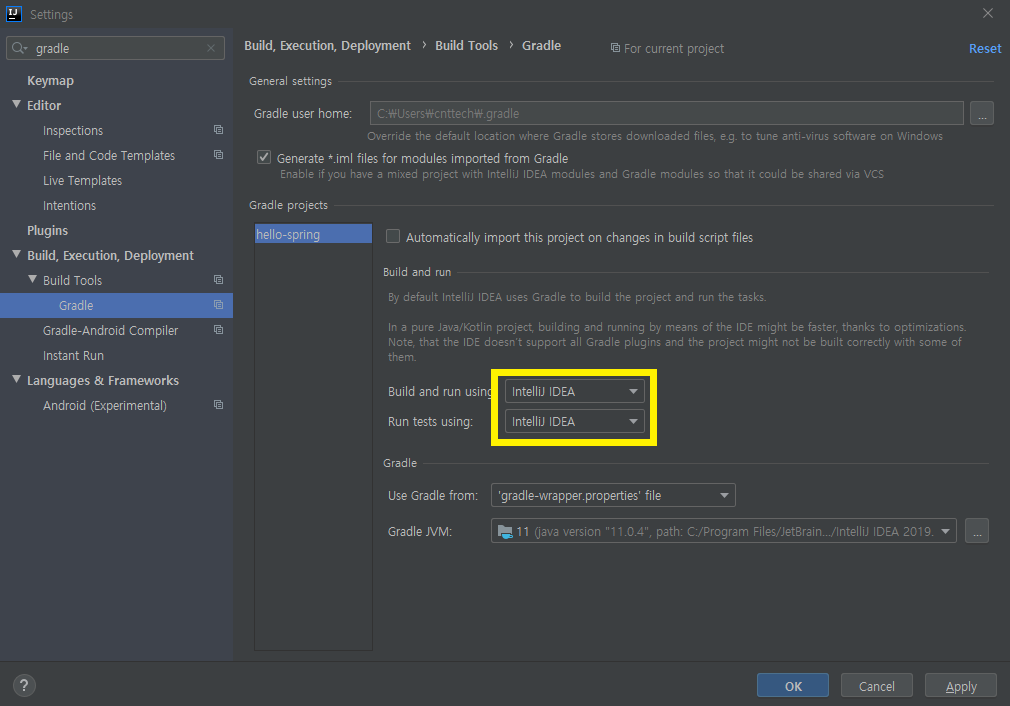 위에 표시한 부분을 Intellij IDEA로 변경하면 gradle을 통해서 run이 되지 않고 intellij에서 java를 바로 띄워 run이 되기때문에 속도가 향상될 수 있다, '성장과정(dev) > Spring + Java + JPA' 카테고리의 다른 글