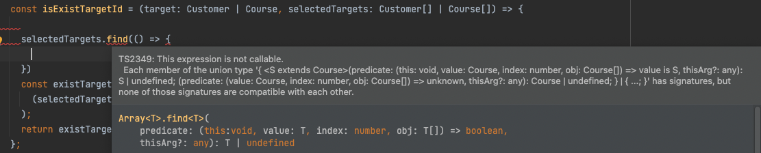 const isExistTargetId = (target: Customer | Course, selectedTargets: (Customer | Course)[]) => { const existTargetIndex = selectedTargets?.findIndex( (selectedTarget: Customer | Course) => selectedTarget?.id === target?.id, ); return existTargetIndex > -1; };참고로 현재는 (Customer[] | Course[]) 이런식으로 썼을 때 findIndex는 저런 에러가 발생하지 않고 잘 되고, find 는 지원하지 않는다.