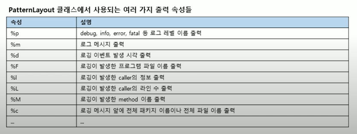 * PatternLayout 클래스에서 사용되는 출력 속성