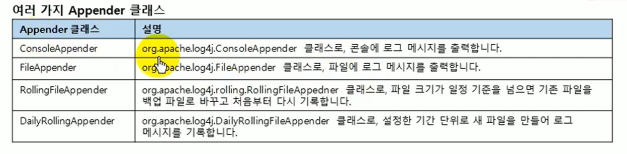 <Appender> - 로그의 출력 위치를 결정 ( 파일, 콘솔, DB 등 )