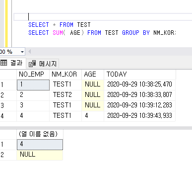 SELECT SUM( AGE) FROM TEST GROUP BY NM_KOR;