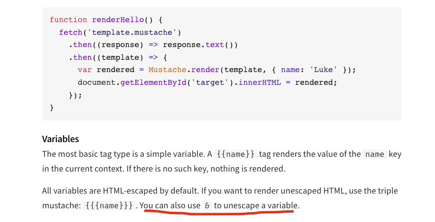 5. npm mustache 의 기능을 살펴보면, html 이스케이프를 사용하고 싶지 않다면 &를 추가하라는 내용을 확인했다.