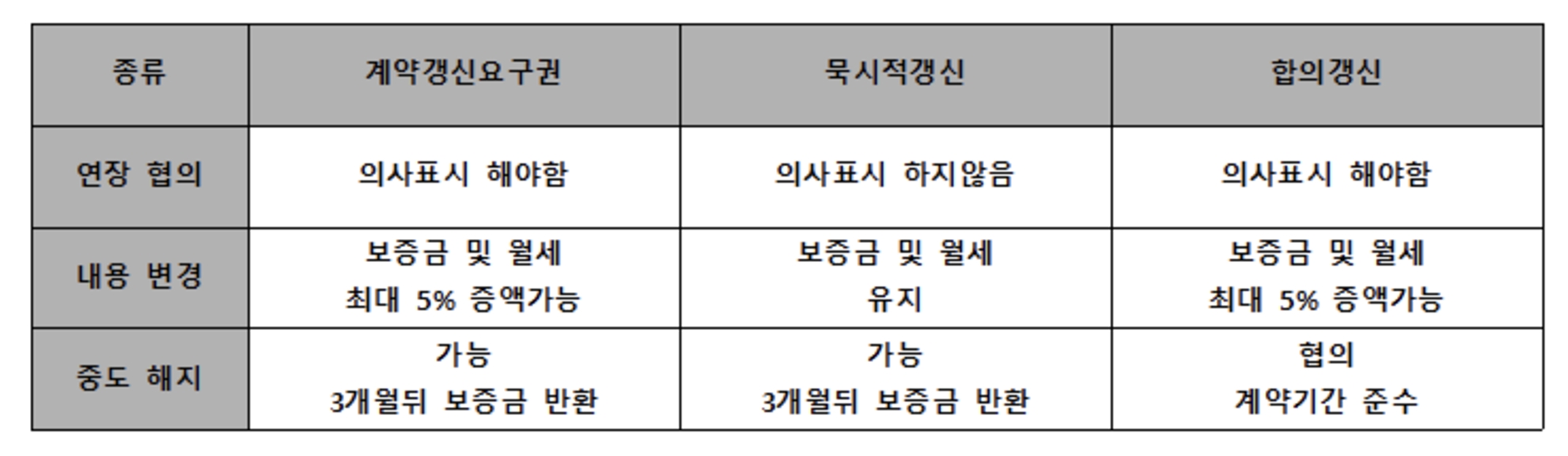 - 합의 갱신: 계약을 쓰지 않았더라도, 합의에 의한 갱신.