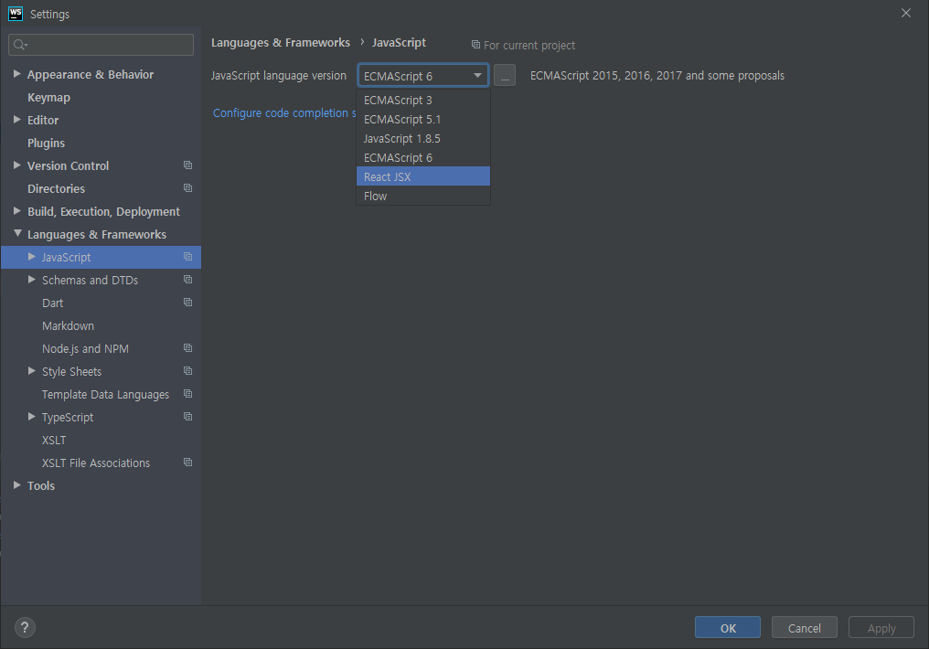 File - Settings - Languages & Frameworks - JavaScript에서 javascript language version 변경